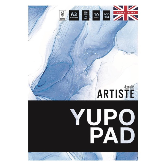 YUPO-paperilehtiö. Sileä synteettinen paperi on ihanteellinen pinta alkoholimusteille. Liimasidonta. A3 (297 x 420 mm), 10 x 100 gsm hapottomilla arkeilla. FSC-sertifioitu.
