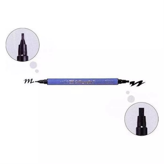 ZIG kalligrafiakynät ovat vesipohjaisia pigmenttitusseja kaksoiskärjillä, joissa on kapea (2mm) ja leveä (3,5mm) kärki. Muste on pysyvää, hapotonta ja valokuvaturvallista.